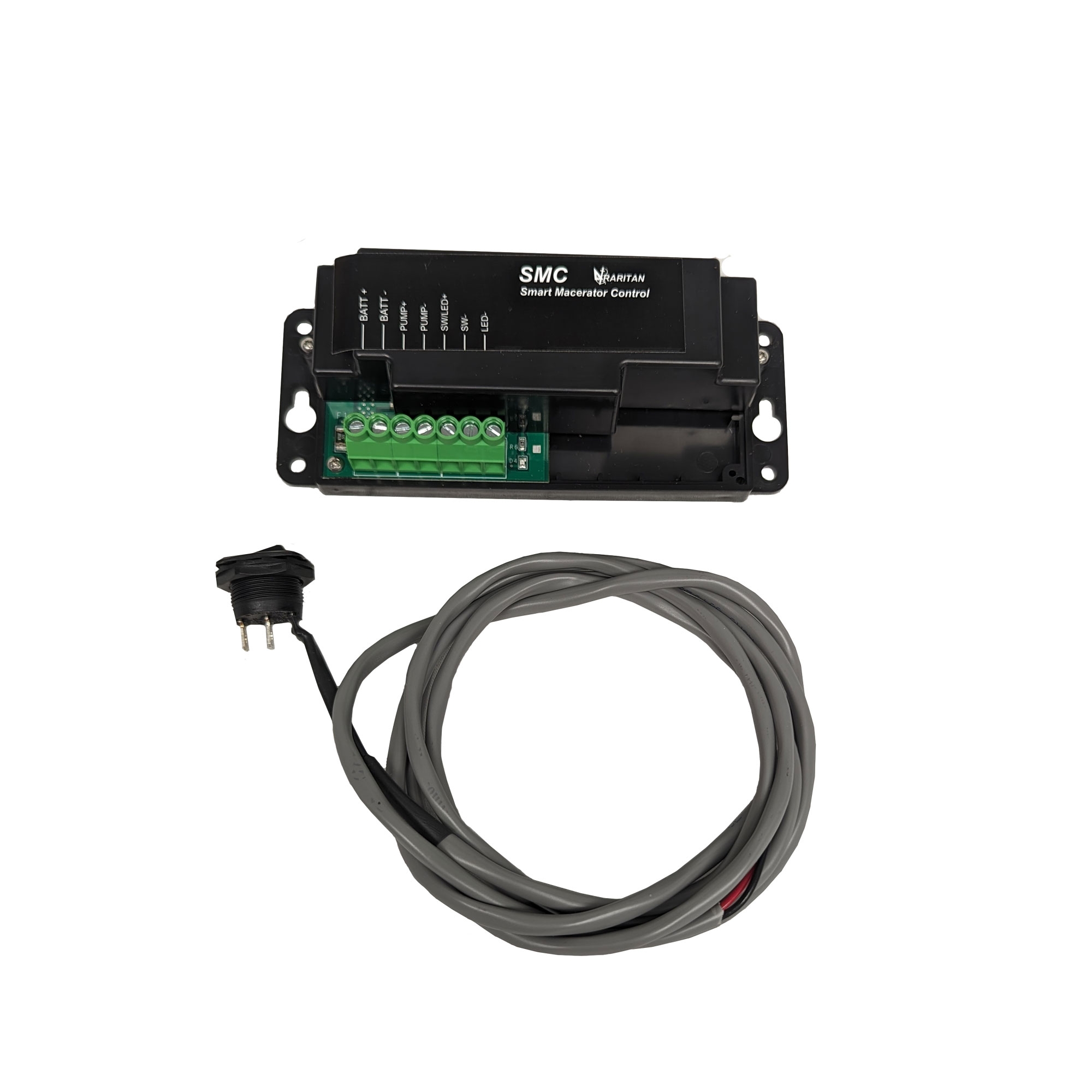 The Smart Macerator Control works seamlessly with Raritan macerator pumps and is compatible with most standard 12V or 24V systems. It is also designed to integrate with a momentary pushbutton or toggle-style switch for activation, providing flexibility based on installation preferences. A built-in LED indicator provides at-a-glance system status, signaling when the system is active, idle, or has shut down due to dry-run protection.